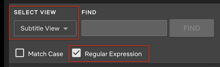To search for regular expressions, press CTRL/CMD⌘ + F, select “Subtitle view” from the dropdown menu, then tick the “Regular Expression” box:
